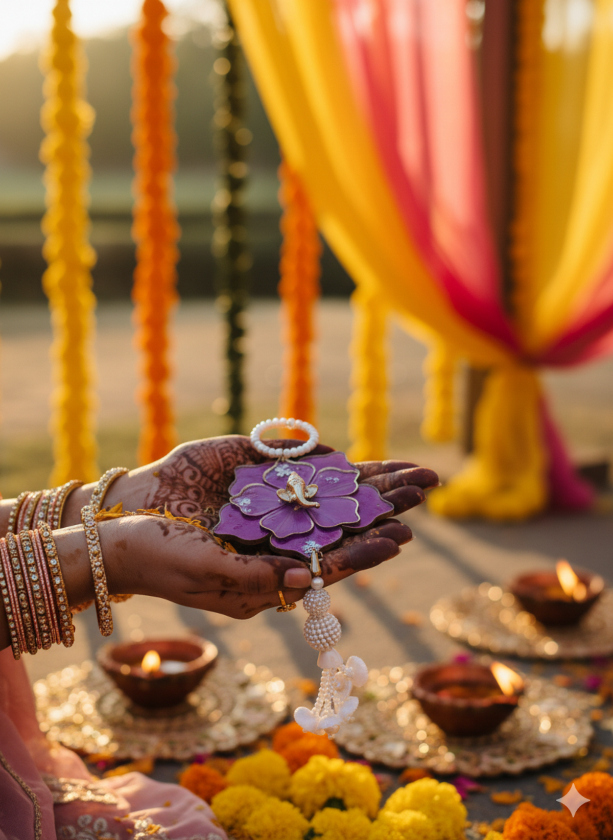Bring divine blessings and artistic charm into your home with this Handcrafted Purple Floral Wall Hanging featuring Lord Ganesha. Designed with a stunning resin flower centerpiece, accented with delicate gold highlights, this hanging is further adorned with pearl beads and dangling ornaments that add an elegant touch.