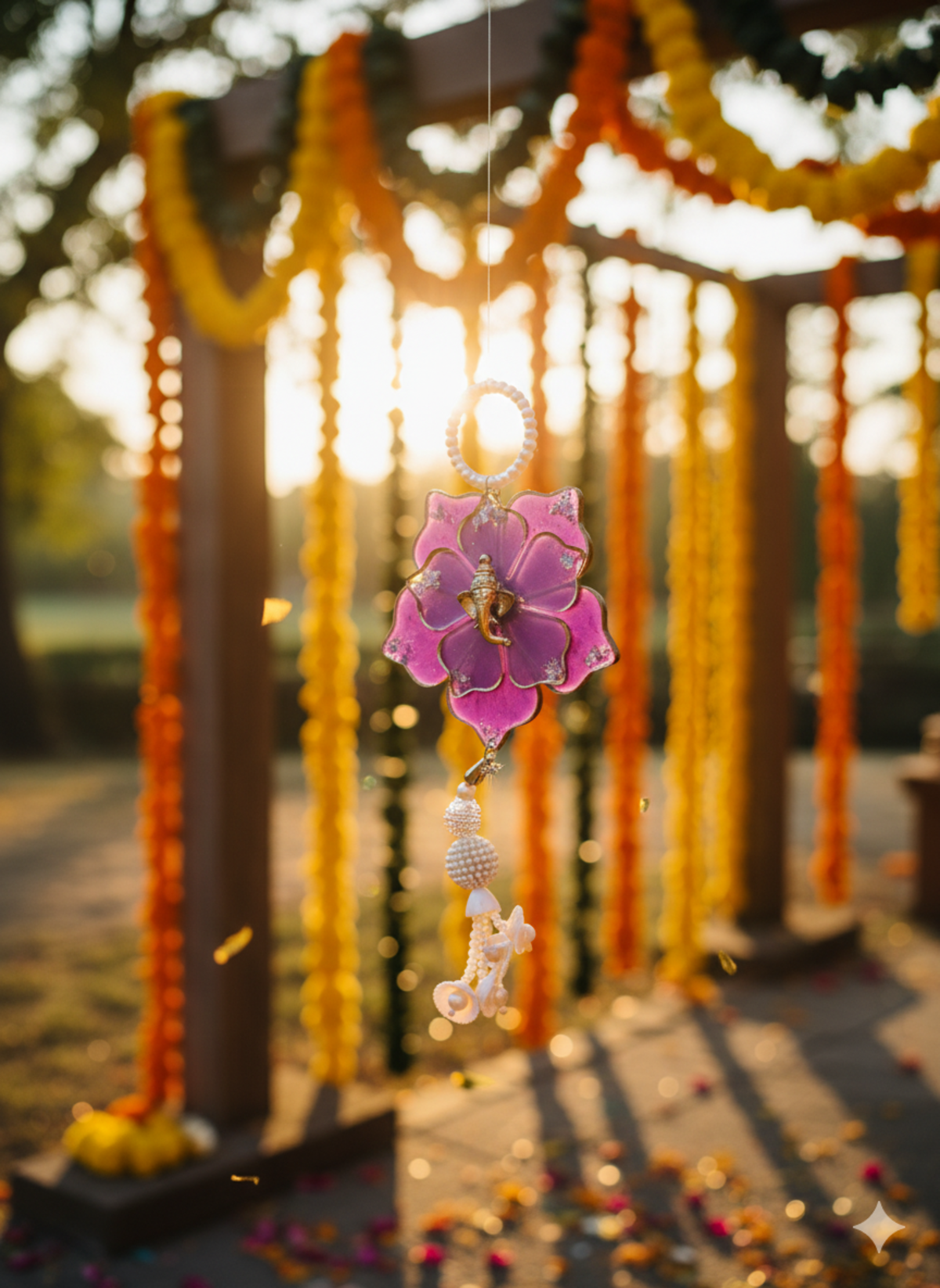 Handcrafted Floral Wall Hanging with Lord Ganesha | Purple Resin Flower Toran with Pearls | Decorative Home & Festival Hanging for Pooja, Diwali & Gifting